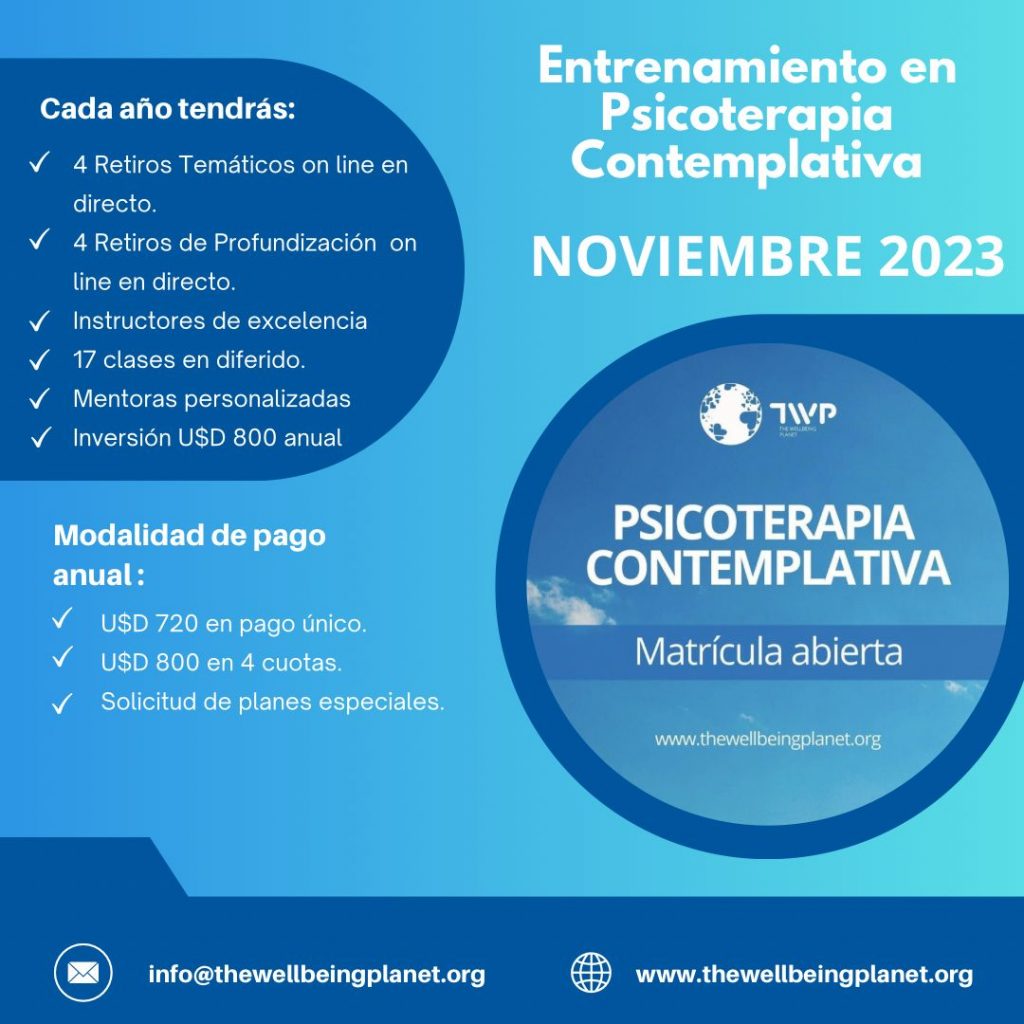 Matriculas al Entrenamiento en Psicoterapia Contemplativa I - II y III - 2023-2024![]() Una invitación de The Wellbeing PlanetEstamos viviendo un momento complejo y rico que nos esta haciendo más y más conscientes de la interconectividad relacional. Sentimos la llamada profunda de hacer algo más allá de la humanidad, hacerlo por todos los seres. Cada persona tiene la oportunidad de crecer y hacerse responsable de sus propios obstáculos, sus retos y oportunidades. Sanándose en lo personal y así construyendo una sanación integral colectiva. Te invitamos a que consideres la posibilidad de formar parte de este proceso transformacional en psicoterapia contemplativa Entrenamiento en Psicoterapia Contemplativa es más que una formación, es un grupo de personas comprometidas con el momento, durante un periodo de 4 años. Para estar presente, sostenerse, trabajar sus propios traumas personales, los de sus comunidades y crecer conscientemente mediante la adquisición de una serie de habilidades, herramientas, métodos, sabidurías y prácticas que te coloca en el mundo Este entrenamiento habla de círculos virtuosos para romper la dinámica del bueno y el malo, el feo y el bello, lo blanco y lo negro, la pobreza o la riqueza, del norte o del sur, del este y del oeste. Propone un caudal relacional que nos abre a vivencias profundas. La mayoría de los estudiantes consideran que el paso por The Wellbeing Planet, cambio sus vidas. Aumentaron su nivel de conciencia, presencia, coherencia, integralidad, compromiso y crearon cambios en sus comunidades que activaron fuertes resonancias. El entrenamiento requiere un gran nivel de compromiso desde el primer día, y es esa intensidad misma la que facilita el gran cambio, la que hace estallar lo más profundo que hay en nosotros. En los últimos 3 años, más de 2.5 millones de personas se han beneficiado de los programas de The Wellbeing Planet. En los últimos 15 años más de 5000 personas han crecido a través del programa de psicoterapia contemplativa. Personas que estaban dispuestos a dar lo mejor de si mismos, acelerar sus comunidades y sanar heridas. Es requisito imprescindible haber realizado al menos 3 cursos básicos en TWP para familiarizarte con la metodología. Nuestro entrenamiento esta presente en 46 países, lo consideramos un programa global, una comunidad que se conecta en presencia y on-line, comprometiéndose en lo individual y lo colectivo Para quien es este entrenamientoEl Entrenamiento de Psicoterapia Contemplativa es para aquellas personas que se encuentren comprometidos con el mundo y su propio proceso. Al mismo acuden terapeutas, consultores, coaches, mediadores, meditadores, médicos, arquitectos, educadores, economistas, políticos, artistas, sanadores- que integran lo que aprenden y lo llevan a sus comunidades Una invitación consciente al crecimiento y al proceso de transformación interdependiente Crea un espacio para tu propia sanación consciente y grupal El Entrenamiento en psicoterapia contemplativa es un proceso de 4 años diseñado para ayudarte a construir las capacidades, competencias relacionales y aprender habilidades practicas, junto con métodos basados en la neurociencia y marcos de trabajo somáticos, emocionales, cognitivos y afectivos que puedes aplicar a tu campo profesional y llevar a tu vida diaria. Este programa es una gran oportunidad para convivir con un grupo de personas durante cuatro años, que son de todo el mundo. Con diferentes biografías y trayectorias, culturas, lenguas y tradiciones. Todo se realiza con un exquisito respeto y se invita a que los participantes se autorregulen, corregulen, integren del otro, reconozcan sus traumas y trabajen para la coherencia del grupo y el desarrollo de practicas contemplativas activas. Debido a las características del programa, y el estrés de nuestras vidas, te recomendamos que reserves tiempo y espacio para este proceso profundo, es un trabajo interior que marcara la diferencia en tu vida Formar parte de un programa de TWP significa reservar periodos de tiempo para estudiar, meditar, comprender, encontrarte con la comunidad y aprender del otro. Esto será sin duda un catalizador de tu propia sombra, y te ayudará a observar tus heridas, avanzando hacia la integración personal y comunitaria. Buscamos estudiantes que se quieran comprometer consigo mismos y señalen al mundo que aprenden para comprender como transformar conscientemente. Pedimos que den prioridad al aprendizaje y crecimiento y que se concentren en observar como aumentando las capacidades- y solo así– se puede servir conscientemente Incripciones AQUI |