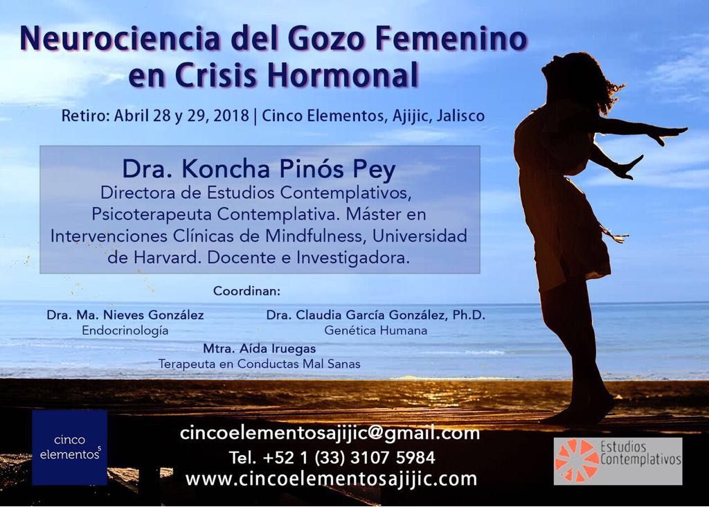 Neurociencia del Gozo Femenino en Crisis Hormonal. 27 Conferencia, 28 y 29 Retiro![]() Neurociencia del Gozo FemeninoConferencia y RetiroImpartido y dirigido por la Dra. Koncha PinósKoncha Pinós Pey Días: 27,28 y 29 de Abril Plan de trabajo 27 de abril Conferencia abierta " Neurociencia del Gozo"Horaio: 19h a 21h Precio: 500 pesos 28 y 29 de abril RetiroIncluye: alojamiento, comida y conferencia del dia 27 de abril Precio: 5.500 pesos Lugar: Ajijic Más información en: info@estudioscontemplativos.com |